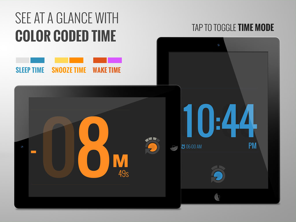 The killer feature is the actual snooze system that auto computes your alarm times based on how many snoozes you want. The time display is HUGE and color coded with optional count down mode - because when you are sleeping you don't care what time it is, but only how much time before it's time to wake up.